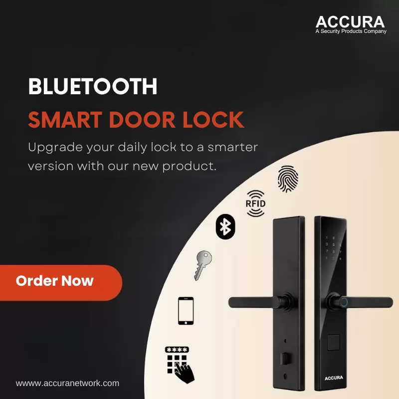 ACCURA Smart Door Lock with Bluetooth is designed for secure access and modern convenience, offering advanced BLE technology with multiple unlocking options for enhanced safety. Built with a premium glass finish, it adds a sleek and modern look to your door.